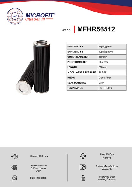 Genuine MicroFit® UltraGen III MFHR56512 filter. Engineered and manufactured in Great Britain the MFHR56512 is designed to meet or exceed the quality and performance of OEM quality standards, ensuring superior filtration performance and the longest possible filter life.Building on over 50 years of filtration expertise, the UltraGen III series is the third generation of MicroFit® filter media, delivering exceptional efficiency and reliability.