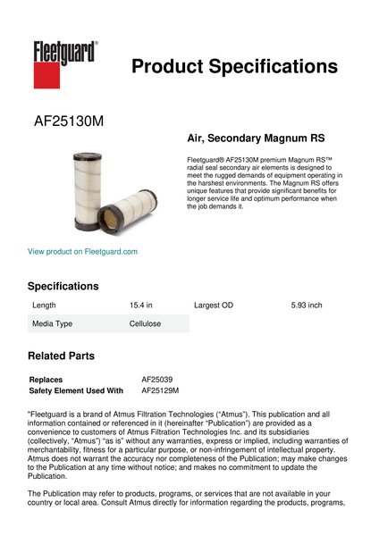Fleetguard® AF25130M premium Magnum RS™ radial seal secondary air elements is designed to meet the rugged demands of equipment operating in the harshest environments. The Magnum RS offers unique features that provide significant benefits for longer service life and optimum performance when the job demands it.Specification