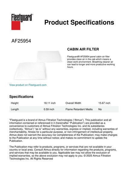Fleetguard® AF25954 panel cabin air filter provides clean air in the cab which means a clean work environment. Breathing cleaner air can lead to longer and more productive working hours.Specification