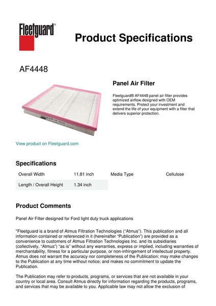 Fleetguard® AF4448 panel air filter provides optimized airflow designed with OEM requirements. Protect your investment and extend the life of your equipment with a filter that delivers superior protection.Specification