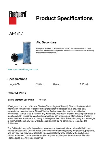 Fleetguard® AF4817 axial seal secondary air filter ensures a proper seal and prevent leaks to prevent airborne contaminants from reaching the combustion chamber.Specification