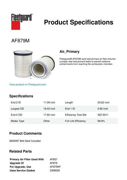 Fleetguard® AF879M axial seal primary air filter ensures a proper seal and prevent leaks to prevent airborne contaminants from reaching the combustion chamber.