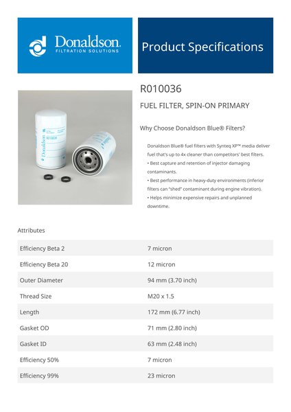 Genuine Donaldson R010036 Fuel Filter, Spin-On Primary is engineered to deliver reliable performance and durability across a wide range of applications. Designed with high-quality materials, it ensures consistent functionality while meeting demanding operational requirements.