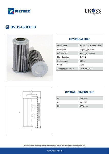 Genuine Filtrec DVD2460E03B. This Filtrec element is designed to meet or exceed the quality and performance of brand OEM’s ensuring superior filtration performance and long-lasting durability.