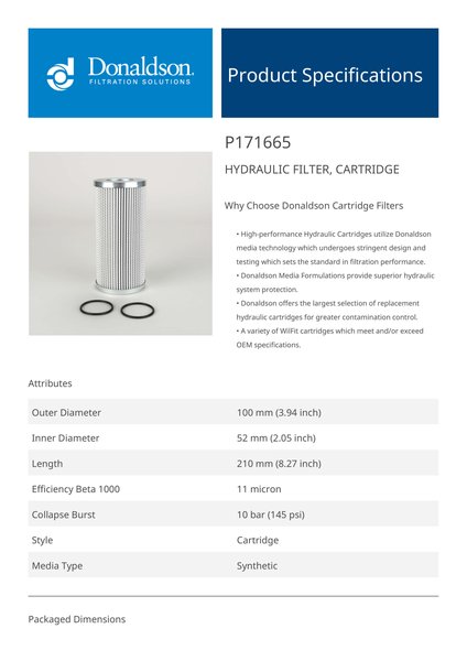Genuine Donaldson P171665 Hydraulic Filter, Cartridge is designed to provide superior protection for your hydraulic system, effectively capturing contaminants to ensure clean fluid circulation. With high-quality filtration media, it extends equipment life, improves operational efficiency, and maintains fluid cleanliness even in the most demanding environments.