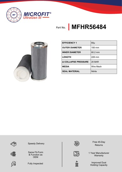 Genuine MicroFit® UltraGen III MFHR56484 filter. Engineered and manufactured in Great Britain the MFHR56484 is designed to meet or exceed the quality and performance of OEM quality standards, ensuring superior filtration performance and the longest possible filter life.Building on over 50 years of filtration expertise, the UltraGen III series is the third generation of MicroFit® filter media, delivering exceptional efficiency and reliability.