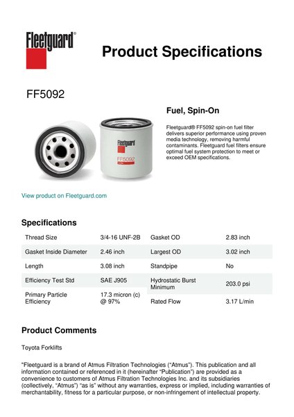 Fleetguard® FF5092 spin-on fuel filter delivers superior performance using proven media technology, removing harmful contaminants. Fleetguard fuel filters ensure optimal fuel system protection to meet or exceed OEM specifications.Specification