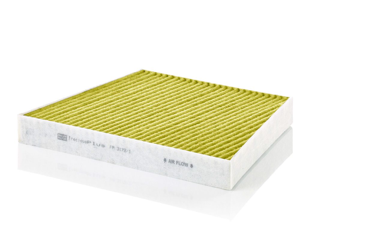 Biofunctional MANN-FILTER FreciousPlus cabin air filters - nearly 100% protection against nitrogen oxides, dust, allergens and mould - harmful gases and unpleasant odours are also eliminated and virus aerosols filtered. The three-layer filter technology absorbs almost 100% of allergens, reduces the growth of molds and bacteria by more than 98% and stops fine dust almost completely.Specification