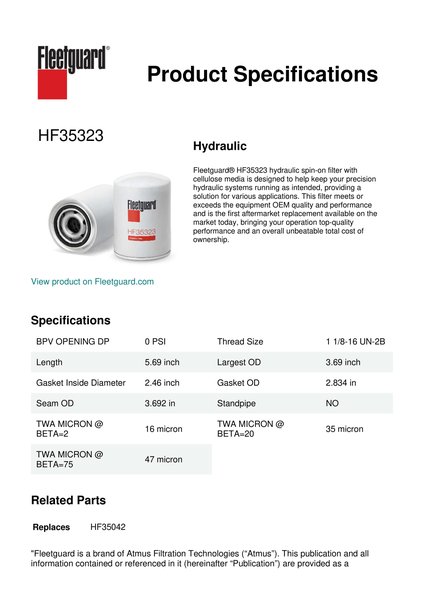 Fleetguard® HF35323 hydraulic spin-on filter with cellulose media is designed to help keep your precision hydraulic systems running as intended, providing a solution for various applications. This filter meets or exceeds the equipment OEM quality and performance and is the first aftermarket replacement available on the market today, bringing your operation top-quality performance and an overall unbeatable total cost of ownership.Specification
