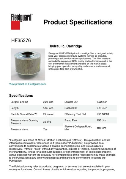 Fleetguard® HF35376 hydraulic cartridge filter is designed to help keep your precision hydraulic systems running as intended, providing a solution for various applications. This filter meets or exceeds the equipment OEM quality and performance and is the first aftermarket replacement available on the market today, bringing your operation top-quality performance and an overall unbeatable total cost of ownership.Specification
