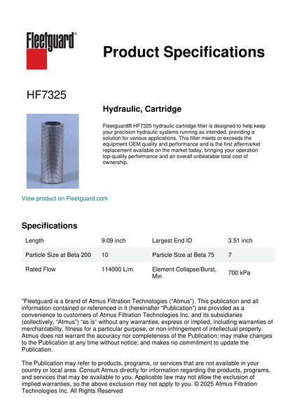 Fleetguard® HF7325 hydraulic cartridge filter is designed to help keep your precision hydraulic systems running as intended, providing a solution for various applications. This filter meets or exceeds the equipment OEM quality and performance and is the first aftermarket replacement available on the market today, bringing your operation top-quality performance and an overall unbeatable total cost of ownership.Specification