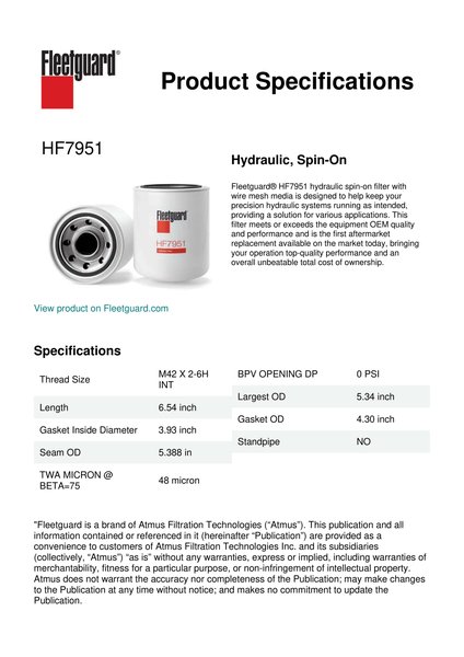 Fleetguard® HF7951 hydraulic spin-on filter with wire mesh media is designed to help keep your precision hydraulic systems running as intended, providing a solution for various applications. This filter meets or exceeds the equipment OEM quality and performance and is the first aftermarket replacement available on the market today, bringing your operation top-quality performance and an overall unbeatable total cost of ownership.Specification