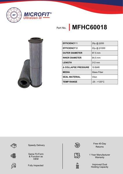 Genuine MICROFIT® UltraGen III MFHC60018 Coreless Filter. Engineered and manufactured in Great Britain the MFHC60018 is designed to meet or exceed the quality and performance of OEM quality standards, ensuring superior filtration performance and the longest possible filter life.Building on over 50 years of filtration expertise, the UltraGen III series is the third generation of MICROFIT® filter media, delivering exceptional efficiency and reliability.