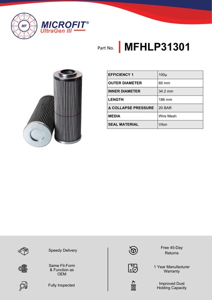 Genuine MICROFIT® UltraGen III MFHLP31301 Pressure Filter. Engineered and manufactured in Great Britain the MFHLP31301 is designed to meet or exceed the quality and performance of OEM quality standards, ensuring superior filtration performance and the longest possible filter life.
