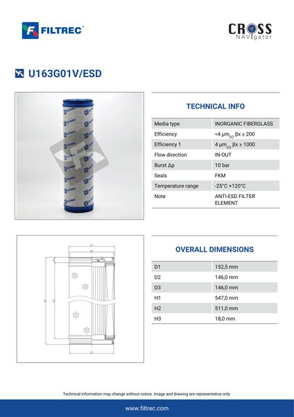 Engineered with their high performance media and a durable design, the U163G01V/ESD provides reliable and consistent performance over its lifespan, even in harsh operating environments. When you order from FilterFinder, you can trust that you are getting a reliable and high-quality replacement filter that will keep your system running smoothly.